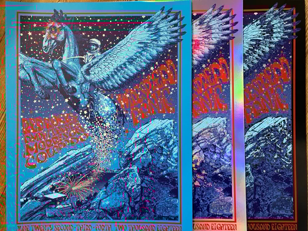 - A four color screenprint 18x24 - Cyan #/40, rainbow foil #/20, black foil #/4 - Designed by J.T. Lucchesi Printed @ RubySue Graphics